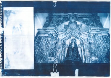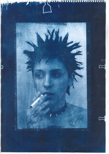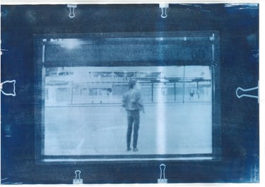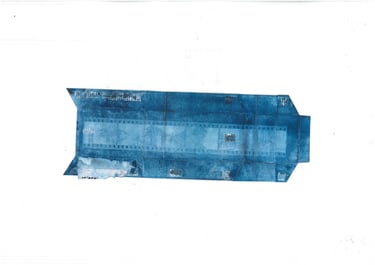 Serie de imágenes en técnica cianotipo. Retomar archivo para convertirlo, desde negativos hasta fotos de viajes o retratos. Fueron realizados en cajas de cigarrillos y hojas de papel A3.